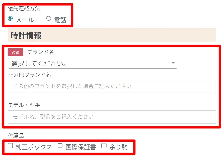 優先連絡方法を指定し、査定を依頼する時計の情報を入力します。時計の型番は保証カードなどに記載があることがほとんどですので、確認して入力しましょう。