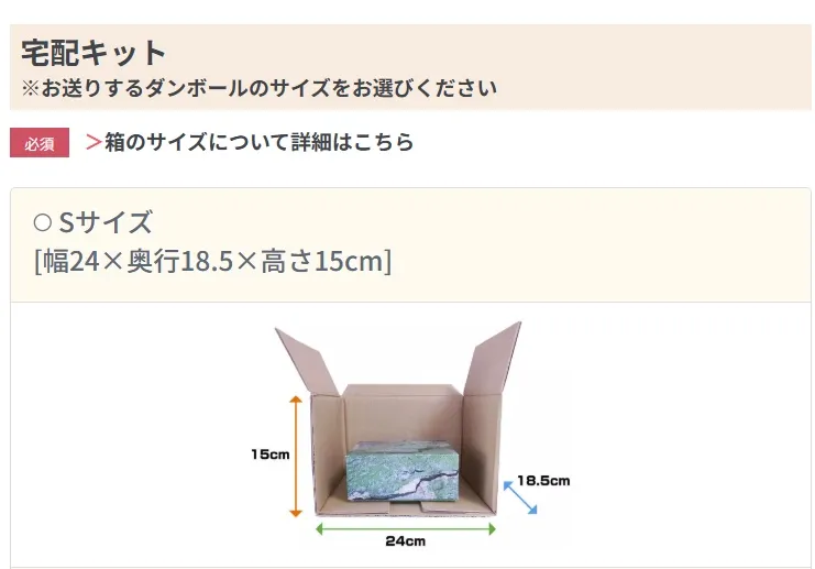 梱包キットの段ボールサイズを選択します。S、M、Lの3種類から選べ、複数本梱包したり、純正ボックスのサイズが大きい場合はサイズに応じた段ボールをリクエストしましょう。
