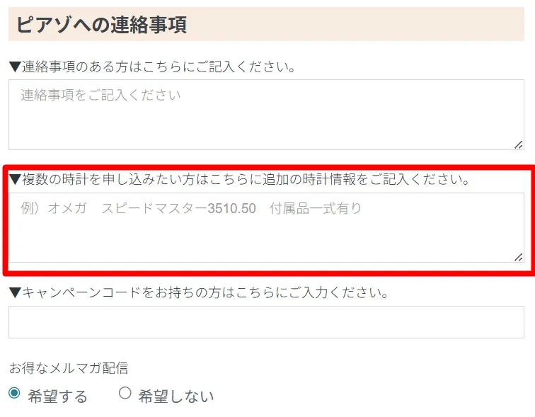 査定時の連絡事項や、複数本の査定を依頼する場合は連絡事項欄に入力しておきます。時計が到着したら連絡してもらうように記載しておくといいでしょう。