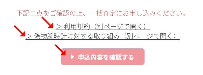 利用規約と不正品の扱いを確認し、申し込み内容確認画面に進みます。内容を確認し申し込みを確定すれば完了です。